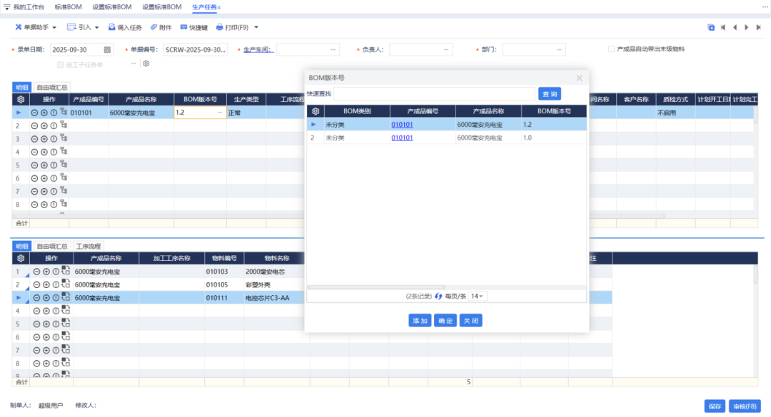 在業(yè)務(wù)單據(jù)中,系統(tǒng)將默認(rèn)帶出用戶預(yù)設(shè)的BOM信息。用戶可自由切換BOM版本,切換后,系統(tǒng)將自動依據(jù)新版本,同步更新所有關(guān)聯(lián)的物料、工序及副產(chǎn)成品。