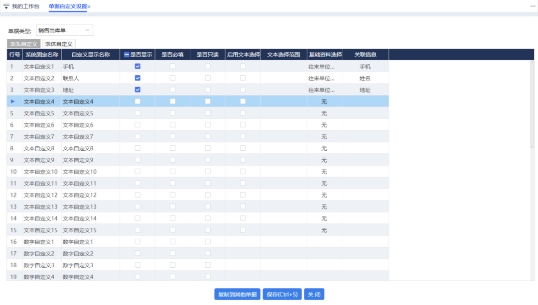 在銷售出庫單表頭啟用自定義字段,從“基礎資料選擇”中關聯(lián)往來單位,并指定需要調用的對應字段(如手機、聯(lián)系人、地址)。