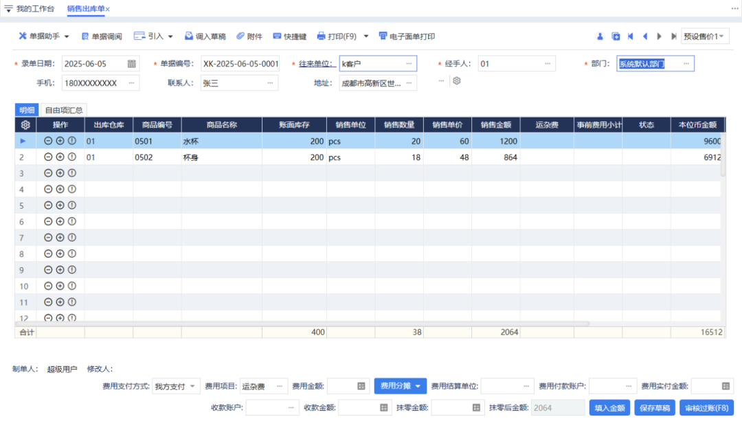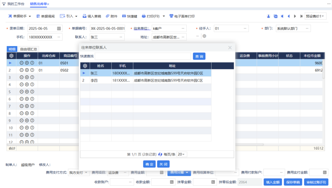 選擇客戶后,系統(tǒng)自動填充首個聯(lián)系人的信息(手機/聯(lián)系人/地址)。如需修改本次送貨信息,雙擊任意字段即可從聯(lián)系人列表重新選擇。