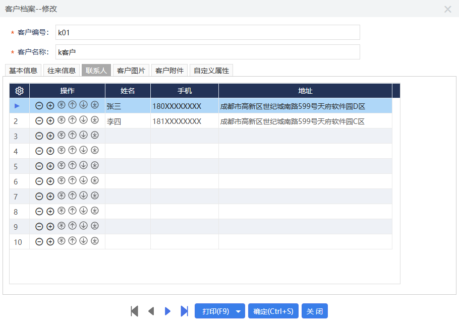 在客戶檔案的“聯(lián)系人”中,可添加多個聯(lián)系人,每個聯(lián)系人包含姓名、手機和地址。操作員可調整聯(lián)系人順序,系統(tǒng)將默認將排序第一的聯(lián)系人信息帶入單據(jù)。