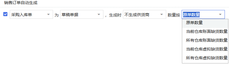 應(yīng)用核心關(guān)鍵點(diǎn),數(shù)量生成規(guī)則選擇“當(dāng)前倉庫虛擬缺貨數(shù)量”,該選項(xiàng)能同時(shí)支持多操作員并行開單,按最新的虛擬庫存缺貨進(jìn)行自動(dòng)生成對(duì)應(yīng)采購單據(jù),保證以銷定采的及時(shí)性。