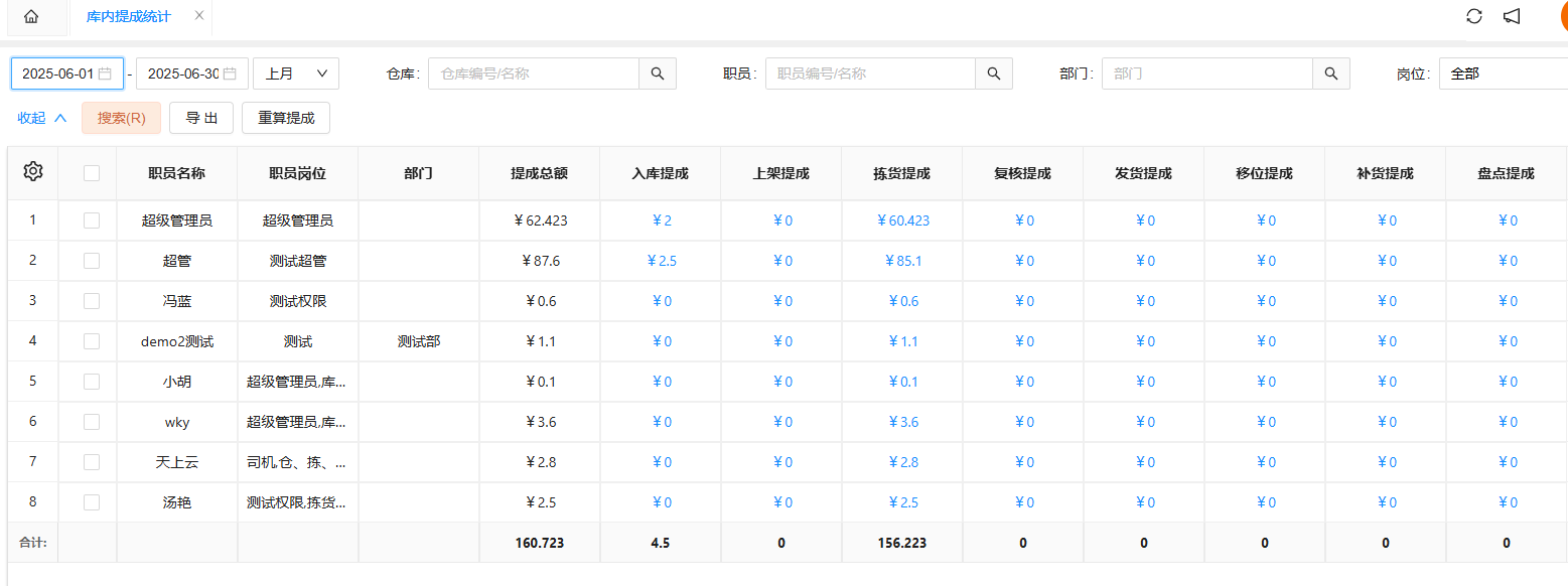 績(jī)效數(shù)據(jù)自動(dòng)生成:每個(gè)員工的上架量、揀貨量、復(fù)核量、發(fā)貨量等數(shù)據(jù)自動(dòng)統(tǒng)計(jì),提成方案還能按單量、重量、體積靈活設(shè)置。