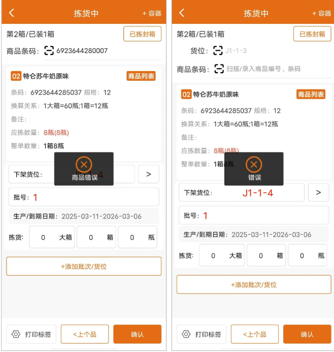 條碼校驗(yàn)防錯(cuò):上架、揀貨、復(fù)核全流程掃碼校驗(yàn),比如揀貨時(shí)掃錯(cuò)商品,系統(tǒng)實(shí)時(shí)提醒錯(cuò)誤,揀錯(cuò)率從 15% 降到 0.5%。